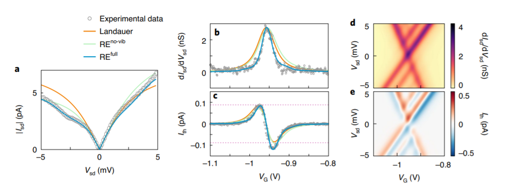图3:理论计算模型与实验数据的比较(a)VG=-0.96V时Isd-Vsd关系图;(b)0偏压时微分电导;(c)热感应电流;(灰色圈圈表示实验数据,橙色线代表Landauer体系理论计算,绿色线代表包括自旋熵的速率方程模拟,蓝色线代表包括自旋熵和振动模式的速率方程模拟)通过运用包括自旋熵和振动模式的速率方程计算出来的(d)微分电导和(e)热感应电流。