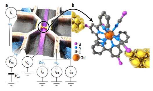 首先,研究者利用电迁移技术和纳米尺度金自断裂技术构建出一个可以实现同时测量与门控电压和偏压相关的单分子结电导、热感应电流的装置(如图1a),该装置可以实现直流和交流的偏压施加,同时可以施加gate电压进行调控,并搭配了可以同时实现热感应电流测量的放大器来求出现塞贝克系数。该工作设计了[Gd(tpy-SH)2(SCN)3]分子作为研究对象(如图1b)。Gd(III)原子具有高自旋磁性中心,因此可以同步研究自旋自由度、电荷自由度和振动自由度。同时,通过将锁定双重调制技术(Lock-in double-modulation technique)和扫描热显微镜(scanning thermal microscopy)、电阻温度计(resistance-thermometer)相结合,可以精准地测量出单分子的热电势。