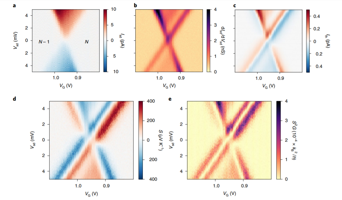 图2:实验测得或根据实验结果计算出的(a)直流电流;(b)微分电导;(c)热感应电流;(d)塞贝克系数;(e)功率因素随偏压和门控电压变化的的关系图。