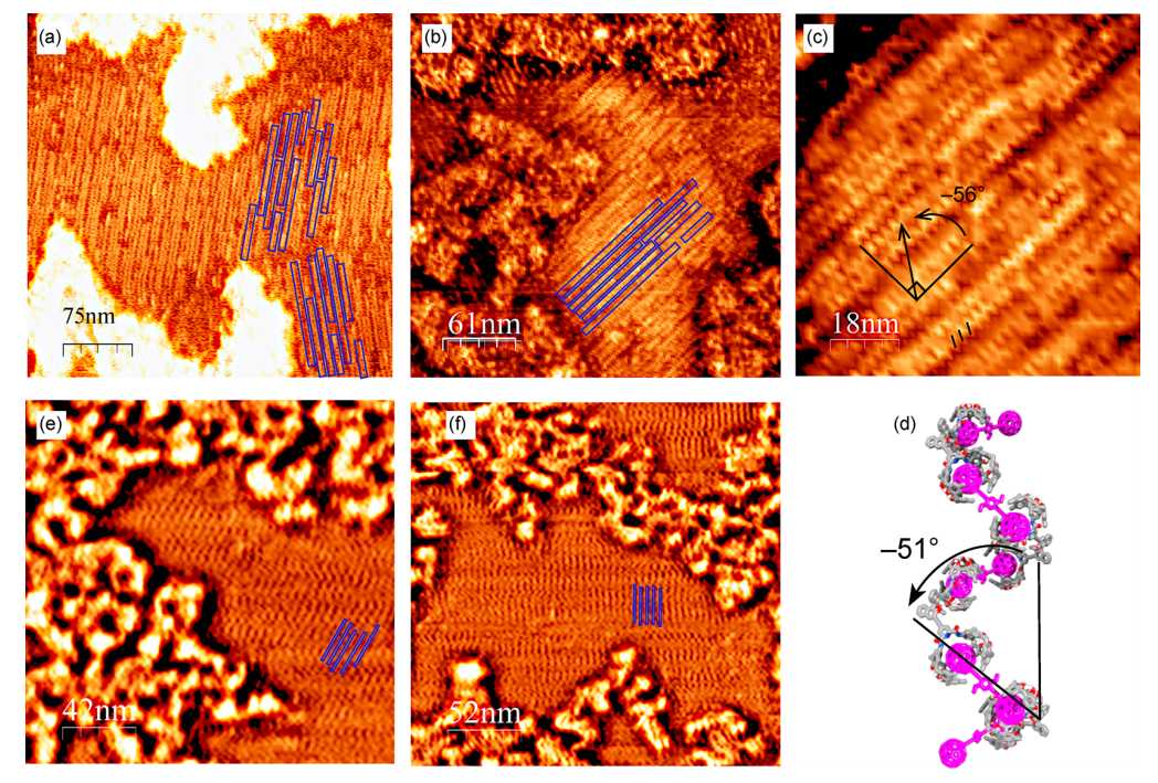 作者将主体分子和客体分子1:1混合后旋涂于HOPG上,于60℃条件下加热3小时,后在室温下减压除去甲苯溶剂4小时,通过AFM观测到了高度取向的螺旋式聚合物(图4A-C)发现,观察到的螺距与螺旋段的计算螺距(5.1 nm)完全一致;周期性的斜条纹相对于主链轴倾斜-56±1°,与计算值相近(-51°)。聚合物链长约为83nm,考虑到螺旋部分由四个单体单元构成,聚合度约为66。聚合物在HOPG表面上对齐,代表了纤维形态(图E,F),说明了螺旋式富勒烯聚合物阵列的形成。