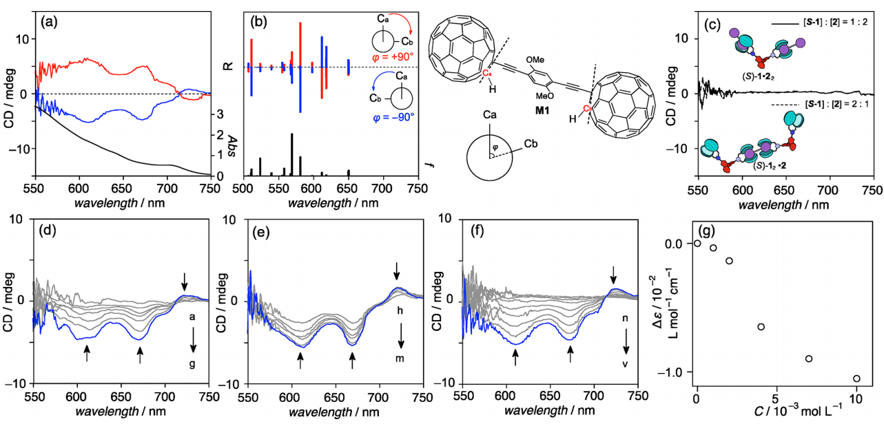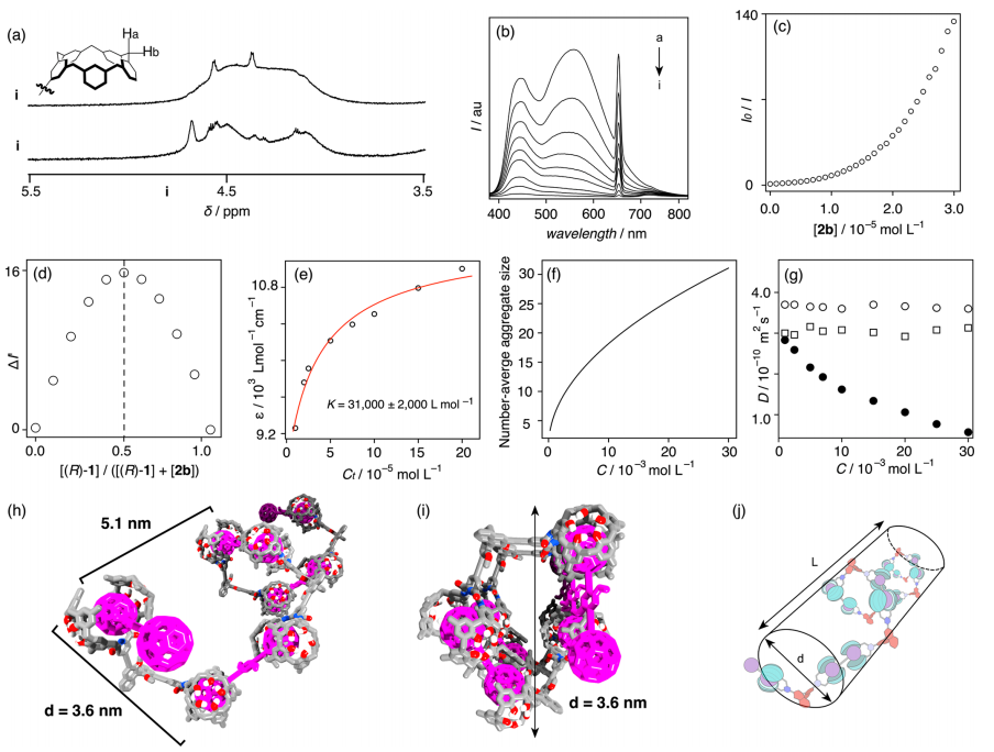 为进一步验证这一猜想,基于含时密度泛函理论计算不同二面角对应的吸收光谱发现(图3B),从650到500 nm的主要跃迁为富勒烯部分的π–π跃迁,说明CD的强度变化取决于二面角,而这最有可能是由于螺旋结构导致。为进一步确认,作者对聚合物进行封端处理,发现未观测到CD信号(图3C)。此外,通过添加功能型主体官能团分子或者富勒烯,均发现CD信号强度减弱(图3D,E),而温度升高则驱动主客体的解离(图3F),总体上聚合物随着总浓度的增加呈现非线性增长(图3G),说明浓度的增加促使其发生了形变,其本质核心在于浓度提升后的协同作用促进了超分子螺旋聚合。