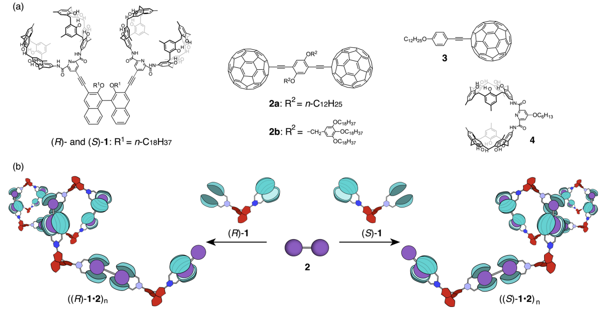 基于此,广岛大学的Takeharu Haino课题组报道了通过分子特异性识别组装构建而成的超分子螺旋富勒烯聚合物。用于超分子组装的分子结构如图1A所示,图1B为超分子组装过程示意图,主体分子(tetrakiscalix[5]arene)中杯芳烃基团通过主客体络合作用以主体分子和客体分子摩尔比为2:1来封装哑铃型富勒烯,并逐步延伸来扩大聚合物尺寸,同时通过联萘基团的轴手性来实现聚合物阵列结构的螺旋化,该螺旋式富勒烯阵列聚合物的成功制备为富勒烯功能材料提供了重要的研究基础。