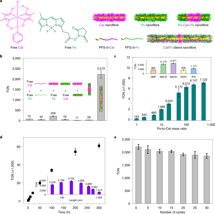 本工作研究了Cat/Ps共混纳米纤维的光催化HER,其中Cat/Ps共混纳米纤维是由嵌段共聚物PFS-b-Cat和PFS-b-Ps按质量比为1∶10通过接种生长组装而成的。此外,作者准备了6组对照组,分别是1)小分子催化剂和光敏剂,2)未形成纳米纤维的PFS-b-cat和PFS-b-Ps,3,4)纳米纤维与互补小分子,5)催化剂和光敏剂纳米纤维,6)Ps-Cat-Ps三段共聚物(图3a)。作者将HER的转换数(TON)定义为氢原子与钴催化剂的摩尔比,并比较了不同体系的TON数值。通过自组装获得的共混纳米纤维的TON数值显著提高(TON = 2219),这个数值比自由分子催化剂/光敏剂对照(TON = 72)的值高大约30倍(图3b)。研究表明这种催化速率显著提高可能与每个系统中催化剂和光敏剂之间的平均距离不同有关,而这种混合组分组成的纳米纤维更有利于催化基团和光敏基团在空间上相互靠近,从而促进了二者之间的电子转移过程。