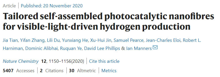 Nature chemistry:调控自组装光催化纳米纤维用于可见光驱动制氢