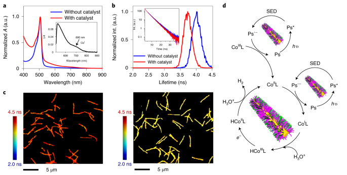 作者通过观察到纳米纤维的微分光谱在680 nm处显示出宽峰,因此将其指定为是催化CoI反应中间体,也认为是质子配位生成HCoIIIL配合物的关键。同时通过拟合与时间相关的衰减量发现(图4b),在存在催化剂的情况下,BODIPY染料的寿命被确定为3.73 ns,而在没有催化剂的情况下为4.01 ns,这表明在催化纳米纤维系统中激子猝灭过程更快。通过对荧光寿命成像(FLIM)分析(图4b),可知在催化剂的存在下,纳米纤维上被激发的光敏剂物种的寿命会缩短。