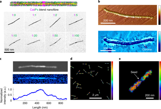 图2自组装光催化纳米纤维的表征。a不同PFS-b-Cat和PFS-b-Ps质量比(从1:0到1:100)的Cat/Ps共混纳米纤维的TEM图;b Cat/Ps共混纳米纤维的AFM图;c钴的STEM图 (上图)、EDX图分析(中图)和Cat/Ps混合纳米纤维的分布图(下图);d,e Cat/Ps共混纳米纤维的STED图 (其中e是d的放大图)。