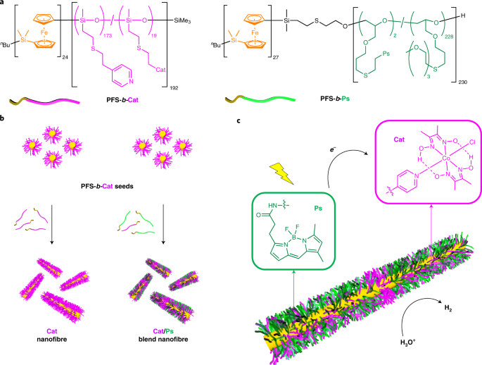 图1自组装光催化纳米纤维的制备及结构示意图。a催化嵌段共聚物PFS-b-Cat和光敏剂嵌段共聚物PFS-b-Ps的结构;b通过种子生长形成的共混纳米纤维示意图;c带有可结晶的PFS嵌段(黄色)、催化剂(紫色)和光敏剂(绿色)的Cat/Ps共混纳米纤维结构示意图。