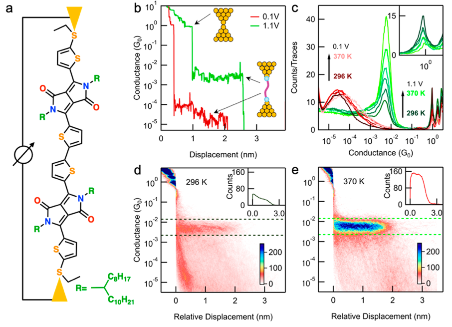 分子的电子密度分布的变化,无论是由光激发还是由氧化还原引起,通常都会导致结构重组。检测具有不同电子构型的分子结构变化的能力对于解释分子物理化学性质至关重要。已经有一些工作通过光学表征,研究了单分子中电子结构与几何构象之间的关系,但是通过电诱导的单分子构象变化的工作却不多。在本文中,作者使用STM-BJ技术测量了二酮基吡咯并吡咯衍生物的单分子结的电导,并表明分子连接结构取决于电子传输的隧穿类型。实验表明,在共振隧穿状态下,分子骨架随电子共轭性的增加而更加平面化。通过控制在分子结两端施加的偏压大小可实现非共振传输和共振传输之间的切换。因此,能够以电驱动分子构象变化。