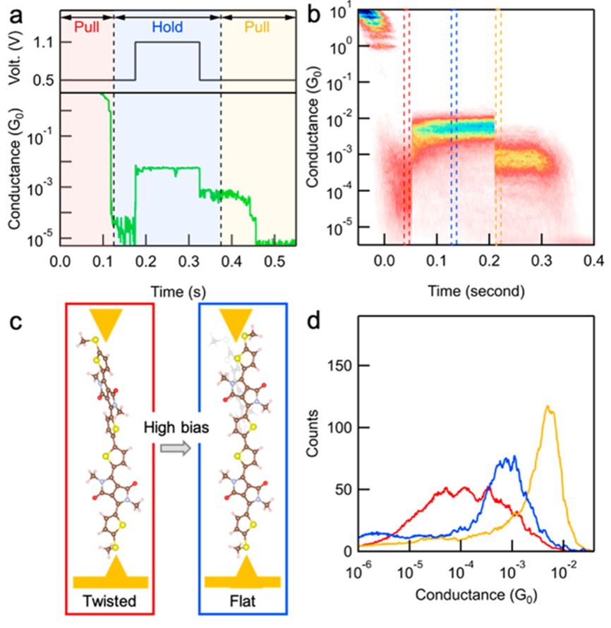 为了更好地理解偏压升高导致构象变化的现实验现象,作者设计了一个悬停变偏压的实验:在裂结过程中,当探测到分子成结时就把分子悬停250 ms,在前50 ms维持偏压0.5 V不变,在中间150 ms把偏压升高并稳定到1.1 V,最后的50 ms再把偏压降回0.5 V(图2a)。如图2 a-b所示,在悬停的前50 ms分子表现为低电导,一旦偏压增加到1.1 V后分子的电导将会增加将近两个数量级到高电导,当最后偏压降回0.5 V后,尽管电导下降,但是仍高于初始的电导值。通过截取图2a中三个时间段内分子的电导数据进行统计,作图后发现三段电导的分布也有很大的不同(图2 d)。在最开始50 ms分子的电导峰展宽(红色)非常大,随着偏压升高到1.1 V,分子峰的展宽变得更窄(蓝色),当最后偏压降回0.5 V(黄色),分子峰的电导变得更大,展宽也变得更窄。这表明了,高偏压引起的共振传输会改变分子的结构,从而导致了非共振电导的增加。并且由于DPP2分子是一个刚性的平面π体系,所以连接两个DPP单元的中心二面角是影响分子电导的关键。作者推测,在较低偏压下,裂结过程中会有各种连接构型同时存在,从而导致分子峰展宽比较宽。但是,当偏压升高到能够使分子进行共振传输时,分子构型就会变得更加平面化(图2c),从而导致分子电导升高。此时再把偏压切回到较小数值时,由于仍然有较多平面化的分子构型被“锁定”,也就使得分子电导值比最开始小偏压下要高。