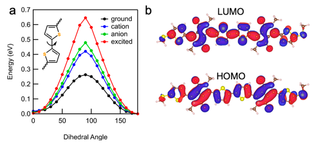 在实验中,DPP2分子在TCB溶剂中缺乏平面化的证据,有可能仅通过HOMO的共振电子传输并不足以驱动分子平面化。为了对此进行进一步研究,作者利用密度泛函理论(DFT)计算了基态、阳离子、阴离子和三线态的扭转势垒与中心二面角的关系,其中更高的扭转能垒表示需要更高的能量去转动分子。共振状态为扭转构象进行分子平面化提供了足够的能量来重组纳米电极结构。从机械的角度进行类比,分子就像是扭曲的弹簧,被电极保持在较高的能量构象中。驱动共振电子使弹簧受力,可以使分子结构更加平面化。并且较高的热能使电极更柔软,从而可以在不破坏分子结的情况下使分子平面化时金电极原子重排更容易进行。作者发现,阳离子和阴离子都有相对于基态更高扭转的能垒,并且激发态具有最高扭转能垒(图4a)。这表明,尽管通过HOMO进行的共振传输可以驱动连接处扭曲分子的平面化,但是获得的能量可能并不足以重组分子末端配体与金属电极的键。但通过两个前线轨道谐振传输则具有足够大的扭转能垒去驱动分子的平面化,如图4b所示。