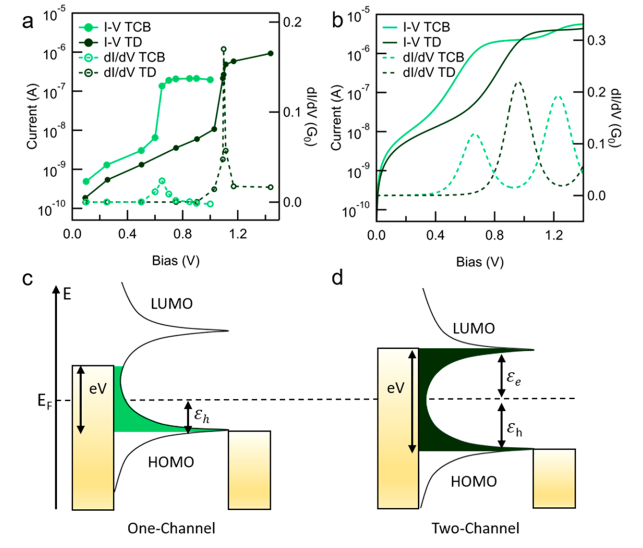 图3 (a)DPP2分子分别在TCB(浅青色)和TD(深青色)溶液中的电流-电压(I-V)以及微分电导(dI/dV);(b)计算得到的DPP2分子分别在TCB(浅青色)和TD(深青色)溶液中的I-V以及dI/dV;(c-d)单通道传输(c)以及双通道传输(d)的能量图。