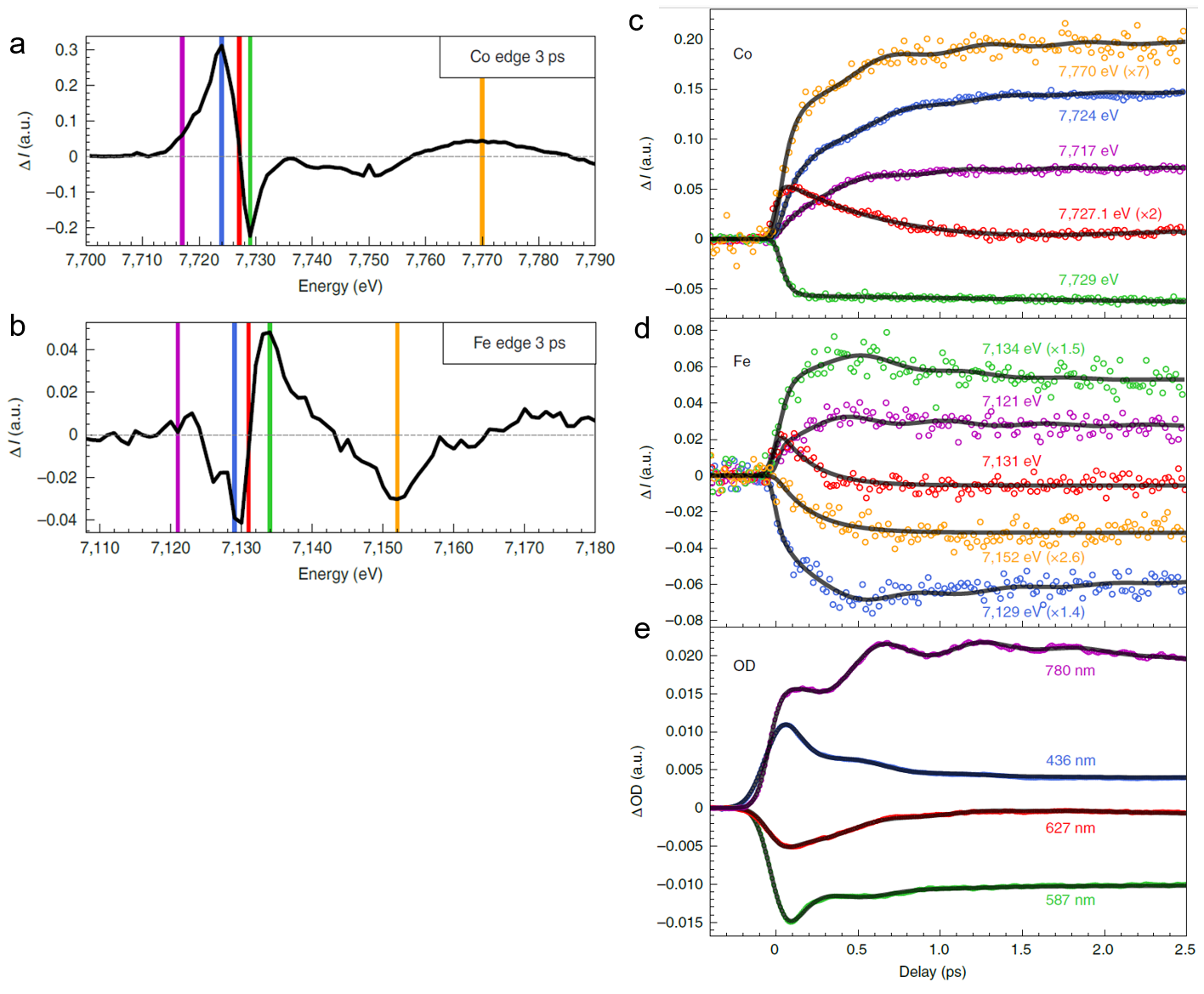 图 4.在PBA被540 nm光激发前后的超快时间范围内,c,d) Co和Fe对不同能量X射线吸收能力的变化,其中不同颜色的数据圈点与a,b)中相同颜色的竖线对应,a,b)中的黑线与图2c,d中的红线等同;以及e)体系对不同波长光的吸光度变化