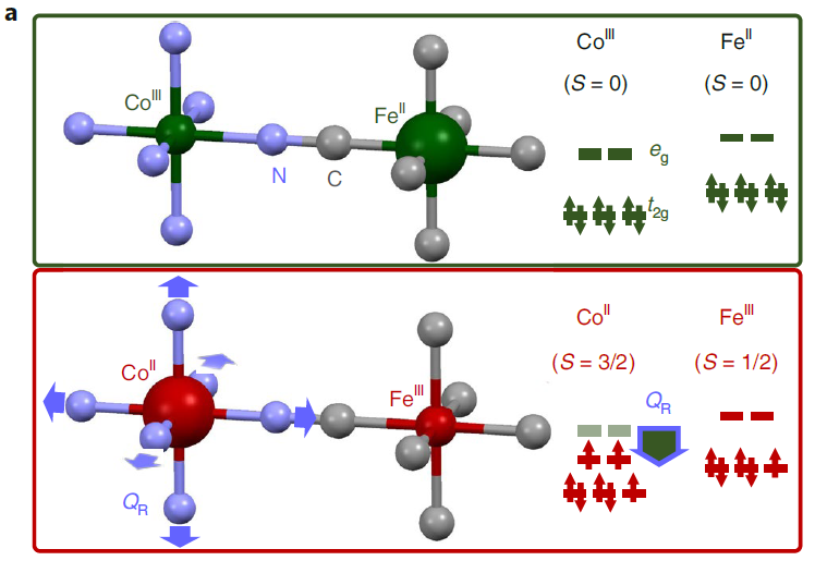 图3. 光激发前后PBA晶格结构的变化和其中金属离子价态和自旋态变化