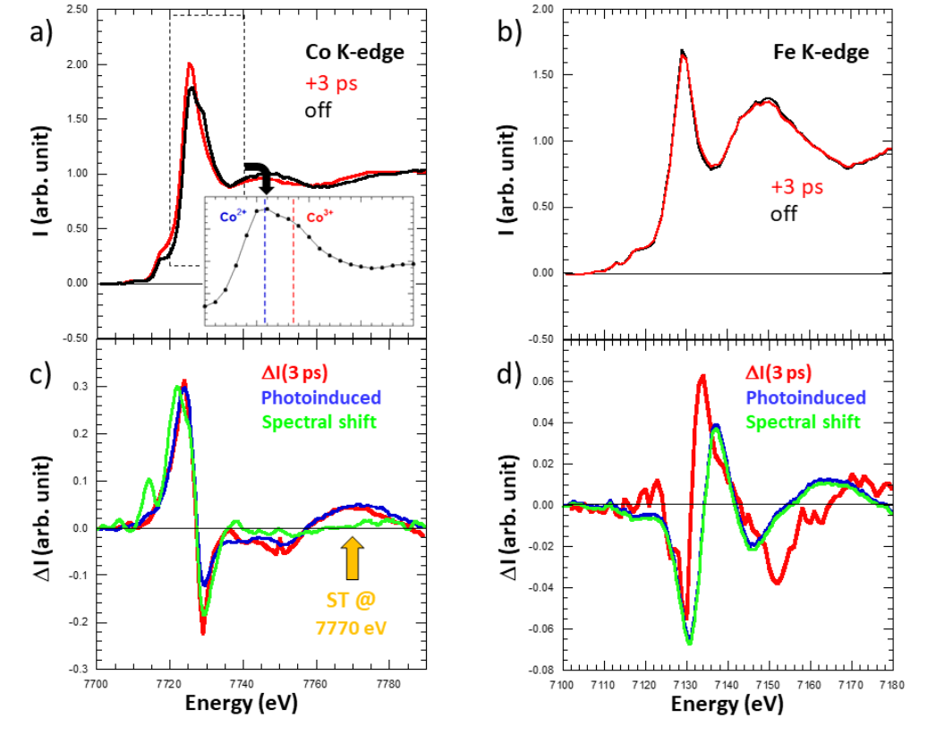 图2. a,b) 纳米晶体中Co、Fe在光激发前和3 ps后的XANES;c,d) 中的红线为a和b的差谱,蓝线表示在施加外压下进行完全光致相变的差谱(不使用超快),绿线表示仅由CT过程对光谱位移贡献的部分(刚性光谱位移)