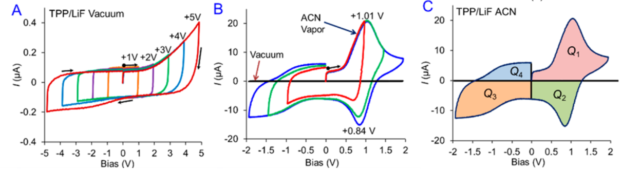 作者首先在真空环境下对该分子结的电流-电压(I-V)特性进行了表征。结果表明,在真空环境下,该分子结表现为平板电容器的特性,在±2 V区间内具有平坦的电流响应;当偏压增大至+5 V时,电流在-1~-4 V区间内出现反向带(图2A),这是由于在正向扫描的过程中TPP的HOMO电子在偏压的诱导下出现分离。在真空中,LiF起到输运势垒的作用,因此由正向偏压注入的电荷被保留在TPP层中,并与对电极上的负电荷形成稳定状态。将TPP/LiF分子结置于乙腈蒸汽中时,其I-V特性曲线上表现出更大的电流,并且具有明显的法拉第峰,类似于电化学反应中的氧化还原现象。当正向扫描偏压从+1 V增加到+2 V时,曲线在+1.01 V处出现一个正向峰,在+0.84 V处显示一个反向峰(图2B)。对I-V曲线进行线下积分,可将电荷量分为4个象限,如图2C所示。分子结在乙腈蒸汽中产生的感应电荷总量比在真空中高出了78倍,表明乙腈蒸汽中分子结的电荷存储量更大。在真空中,有108%的正电荷(Q1+Q4)在负扫描期间(Q2+Q3)被恢复;而在乙腈蒸汽中,则有107%的正电荷被恢复,表明了LiF势垒的漏电流很小,电荷被有效地储存。
