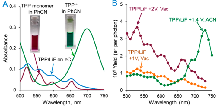 图3 (A)TPP单体氧化前后、TPP低聚物(eC电极上)的紫外-可见光谱;(B)TPP/LiF分子结在真空中、乙腈蒸汽中的光电流谱图