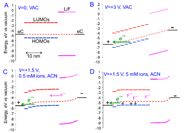 最后,作者通过HOMO-LUMO能级理论解释了乙腈蒸汽对TPP/LiF分子结电输运过程的影响。图4A为0偏压、真空下的能级图,其中HOMO能级为-5.5 eV,LUMO能级为-2.5 eV。假设在真空中的电场为线性,电子由TPP转移到邻近的电极上,当偏压大于5 V时,电容可增加2~3倍(图4B)。在乙腈中,LiF变为自由移动的Li+和F-,导致电场变为非线性。由于LiF的贡献,导致低偏压时的电容增加。而电容大幅增加的主要原因是TPP的氧化,使得F-能够渗透到TPP薄膜中,补偿了TPP•+的空间电荷从而提供了法拉第电荷,并且半充满的HOMO能级为TPP层内提供了电子传输通道,提高了电流(图4C)。此外,当离子浓度增加,注入势垒减小,使得电子可以通过近共振传输的方式由TPP HOMO能级流向电极,减小了传输距离(图4D)。