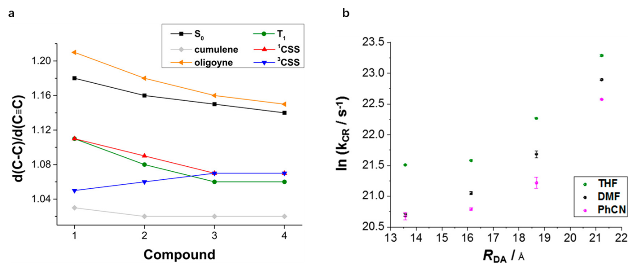 图4 分子1-4中C-C键与C≡C键的平均长度比(a); 在THF, DMF及PhCN中,电荷复合速率常数与电子供体-受体距离的对数关系图(b)。