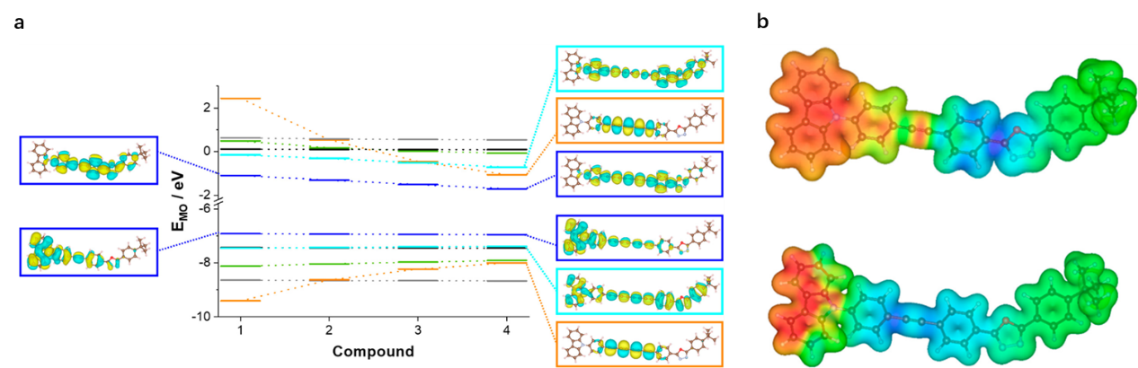 图3 分子轨道及其能级分布(a);分子1的单重态及三重态的静电势分布图(b)。