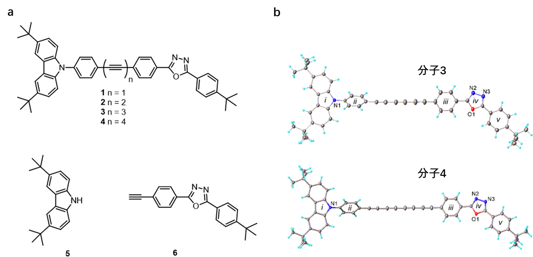 图1 本文中系列化合物的结构式(a);分子3和4的X-射线晶体结构(b)。