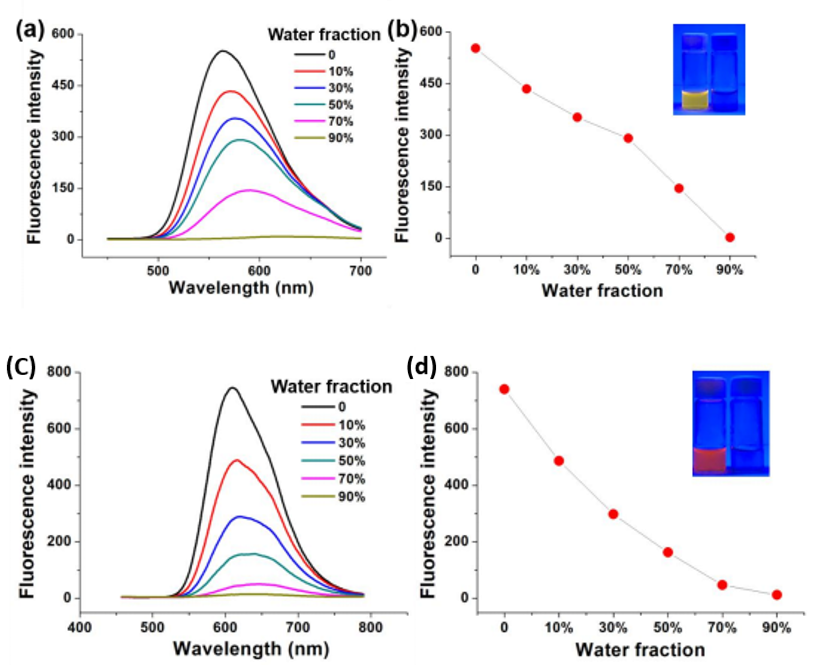 图2 (a)、(b)DTBT荧光光谱和在四氢呋喃溶液中水含量与荧光强度关系曲线;(c)、(d)DTBS荧光光谱和在四氢呋喃溶液中水含量与荧光强度关系曲线