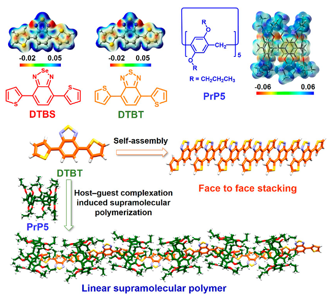 图1 DTBT,DTBS和PrP5的化学结构和电子密度表面上的静电势分布,以及DTBT和PrP5⊃DTBT在固态下的自组装形态。