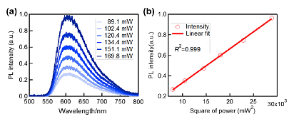 图7 在不同激发功率下,在1030 nm激发下PrP5⊃DTBT共晶体的PL光谱; (b)PrP5⊃DTBTPL强度与激发功率平方的线性拟合函数。