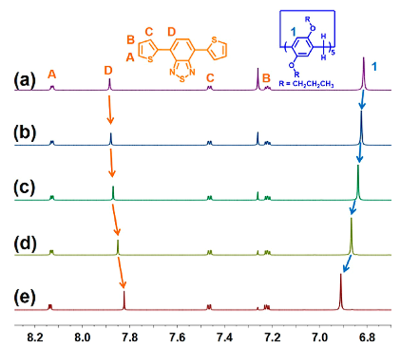 图4 等摩尔PrP5和DTBT在不同浓度下的部分1H NMR(500 MHz,CDCl3,293 K)光谱:(a)12.0,(b)25.0,(c)50.0,(d)100和(e)200 mM。