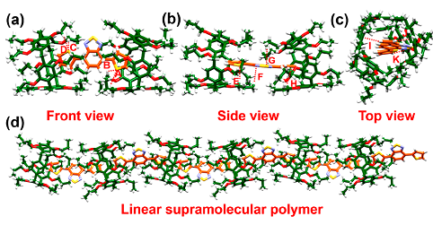 随后,作者通过缓慢蒸发聚合物溶液,获得PrP5⊃DTBT和PrP5⊃DTBS的复合共晶体,并单晶衍射确定其精确的超分子聚合物结构。实验发现PrP5和DTBT确实形成了线性A2B2型超分子聚合物结构(如图5所示),该过程的主要识别行为发生在DTBT上的噻吩部分和PrP5上的丙基之间。形成了四个C-H-S相互作用(A–D)和四个C-H-π相互作用(E–H)(图5 a,b),这在热力学上保证了主体客体复合物的稳定性。此外,DTBT的三个氢原子与PrP5芳香环的π平面相互作用(图5 c中的I, K),表现出形成线性超分子聚合物结构的额外驱动力。从顶视图(图5 d)可知PrP5在复合物中形成一维(1D)通道结构,DTBT / DTBS分子被定向调控在柱芳烃腔内。