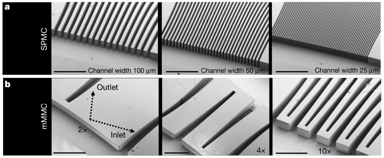 a. 具有平行直管微通道(SPMC)结构的电镜表征结果,比例尺宽度为1 mm;b. 单片集成歧管式微通道(mMMC)结构的电镜表征结果,比例尺宽度为0.85 mm。