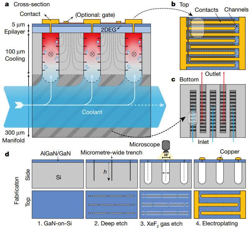 该研究成果对于器件冷却效率提升能耗降低有着显著的意义,并有望提高晶体管的集成度,进一步拓展摩尔定律的极限。作者设计了一种单片集成歧管式微通道(monolithically integrated manifold microchanne,mMMC)冷却系统,将微液流通道布置在电子器件的下方。其剖面图如图2a所示,电子器件层位于GaN外延层上,其下方为冷却液所流经的微通道。冷却液管道和器件图形之间通过铜层实现密封(图2b),芯片底部则为线宽较大的主散热管道,通过背面腐蚀工艺制备(图2c)。此芯片的核心设计革新在于微液流通道的集成,其具体实现方案如下(图2d):