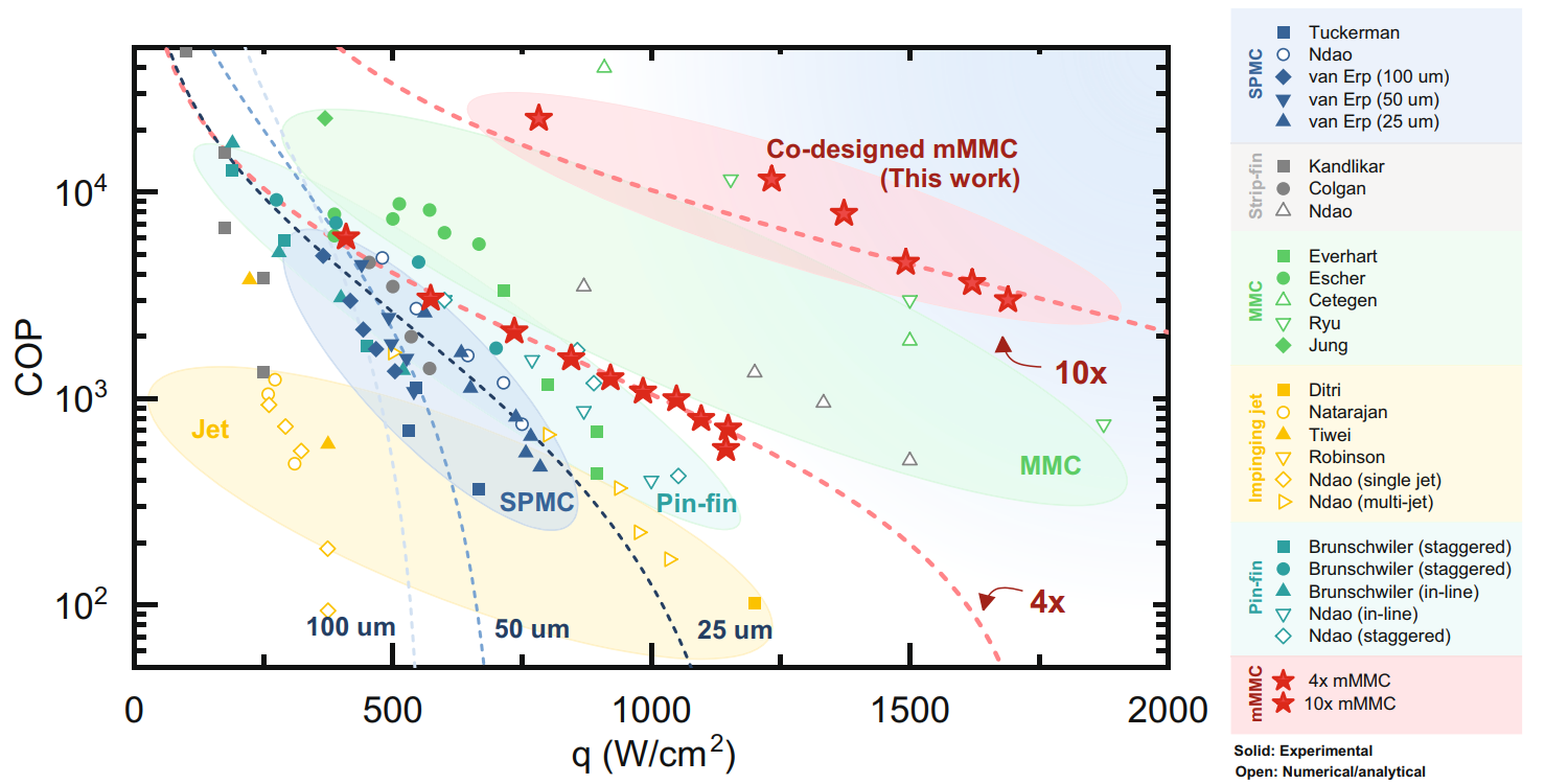 利用去离子水作为冷却剂,在10流道歧管mMMC结构上最高可实现高达1723 W/cm2的热通量。与他们此前的(25 μm宽的SPMCs)方案相比,10流道歧管的mMMC结构的冷却性能系数(cooling coefficient of performance, COP)提升了50倍。作者进一步比较了文献报道中的各类冷却器的热通量及COP值,可以看出这种mMMC设计具有优越的冷却性能(图4)。