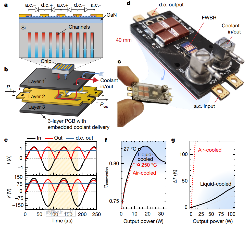 a. 装置结构示意图;b. PCB设计实现冷却液进出;c, d. AC-DC转换器实物照片;e. 转换器的整流波形;f. 空气冷却以及液体冷却器输出功率与转换效率的关系;g. 两种冷却方式输出功率与温度变化的关系。