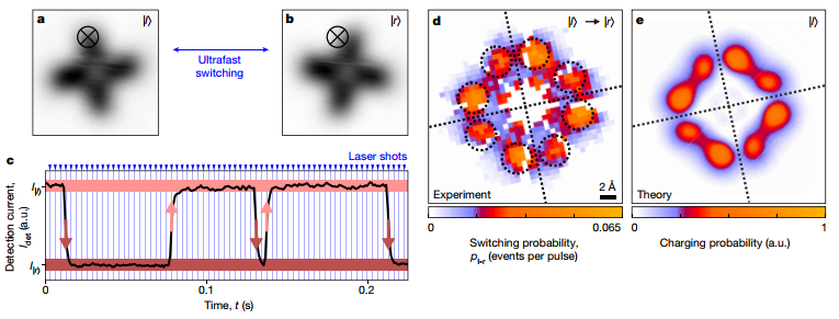 为了确定在超快电子注入下L到R态的转换概率(图2a, b),作者进行了单脉冲实验(图2c),通过脉冲激励次数作为样本量,统计L到R态以及R到L态的转换次数,从而得到L到R态的转变概率为0.025。如图2c中的箭头所示,每一次转换都是瞬间完成,引起一个隧穿电流的阶跃。通过扫描XY平面的概率密度可以得到图2d所示的强度图,其结果也与理论计算结果图2e吻合。