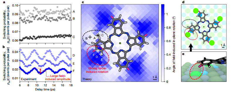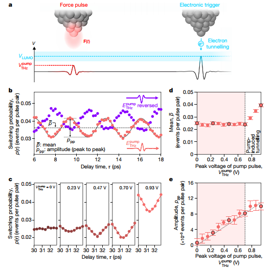 为了探究这个结构转换的动力学过程以及超快力激励的存在,作者设计了如下实验(示意图如图3a)。通过第一束非共振的太赫兹脉冲去触发针尖对分子施加一个飞秒时间尺度的作用力,从而激励分子发生振荡。再通过第二束与分子LUMO共振的太赫兹脉冲去诱导针尖对分子注入电子,触发L和R的构型转换。最后,通过控制两束脉冲的时间差来得到图3b所示的结构转换动力学。对动力学进行分析可以得到这个构型转化的频率为0.3THz,并且存在偏振依赖性。研究第一束脉冲的功率依赖性可以发现,在非共振能量区间,构型转换的平均概率不随力脉冲发生改变(图3d)。而振幅与功率成线性相关(图3c,e),进一步证实了非共振太赫兹引入了一个超快时间尺度的力作用。