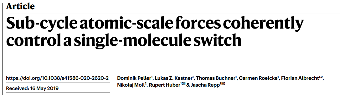 因此,将两者结合以同时实现纳米空间尺度以及超快时间尺度上的突破成为了纳米科学领域最前沿的研究方向之一。其中一个非常重要的里程碑式的工作是超快太赫兹STM的发展(THz-STM)。2013年,加拿大Alberta大学的Frank A. Hegmann课题组首次报导了超快THz-STM技术,实现了<500 fs的时间分辨以及2 nm的空间分辨率,并观测到了飞秒时间尺度的单个InAs纳米点的载流子捕获过程。之后,德国Regensburg大学的Jascha Repp以及Rupert Huber课题组又将THz-STM应用于单个分子的飞秒成像研究,首次获得了单个分子的飞秒电荷转移过程的电子轨道图。最近, Jascha Repp以及Rupert Huber课题组再度合作,利用THz-STM,对吸附在单晶NaCl表面的具有双稳态的单个酞菁镁分子(MgPc)进行了飞秒时间尺度的力学操纵,并且探究了力学微扰作用下,双稳态转换的超快动力学