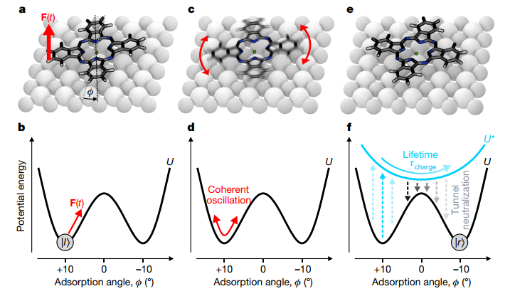 该文章实验思路如上图所示, MgPc分子在氯化钠表面存在+10°(L,图1a)以及-10°(R,图1e)两个能量相同的稳定吸附构型。从能量上考虑,酞菁镁分子对称轴(以Mg-N键为轴线)与氯化钠[110]晶向的不同夹角的能量示意图如图1b所示,L和R在图中体现为两个能量简并的势阱。当施加一个原子级的作用力去激励MgPc时,能够相干驱动MgPc分子,使其在平面内发生小幅度的振荡(图1c, d),其时间尺度在飞秒和皮秒级。而MgPc在获得一个电子变成还原态时,能量高于基态L和R态转变的能垒(吸附角为0度时),在弛豫回基态的过程中会以特定的概率回到L或R态(图1f)。因此,在超快时间尺度去注入一个电子驱动MgPc发生构型转换时,力激励导致的分子振荡就会相当于一个微扰作用去影响MgPc转换成L或者R态的概率,而通过不同时间这个转换概率的变化就可以得到这个力微扰下的结构转换动力学。