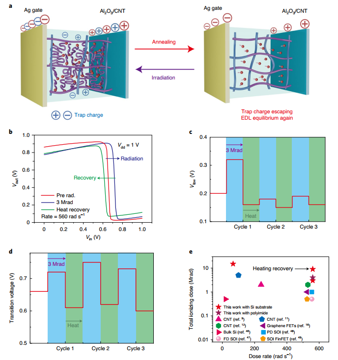 图4 a 离子凝胶碳纳米管场效应晶体管退火自修复示意图;b 逆变器退火前后的电压传输特性曲线;c-d 离子凝胶碳纳米管场效应晶体管单元器件与相应逆变器的辐射-退火循环性能测试;e 离子凝胶碳纳米管场效应晶体管单元器件与相应逆变器的抗辐射性能与之前工作的对比。