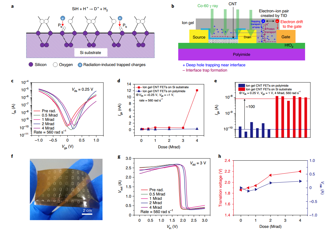 在以上实验中,作者展示了以硅作为基底的离子凝胶碳纳米管场效应晶体管及集成电路优异的抗辐射能力。然而由于硅基底上悬挂键缺陷的存在导致产生界面电荷陷阱来捕获电子(图3a),使得器件阈值电压偏移和亚阈值摆幅增大。另外,硅基底还可能会将辐照的高能粒子反射到有源区和介电层中,从而引起二次辐射损伤。随后,作者采用聚酰亚胺代替硅作为基底来进一步提升离子凝胶碳纳米管场效应晶体管的抗辐射能力。如图3b所示,当采用聚酰亚胺作为基底时,离子凝胶中辐射感生的电子离子对中部分离子将与电子重新结合,另一部分将移动至碳纳米管与离子凝胶的界面附近,诱导形成电荷陷阱捕获电子,导致晶体管Vmin正向漂移。然而在该器件结构中,离子凝胶中的离子扩散距离较短,很难穿过双电层,因此使得双电层下这部分离子诱导的界面陷阱密度大幅度降低。另外与硅基底相比,聚酰亚胺基底具有更疏松的结构和更小的散射截面,辐照的高能粒子更容易穿透聚酰亚胺基底,而非滞留在基底内或在基底表面反射,因此大幅度降低了辐照效应对晶体管器件的损伤。图3c-h展示了以聚酰亚胺为基底的离子凝胶碳纳米管场效应晶体管及相应逆变器集成电路的抗辐射性能,可以发现在4 Mrad的辐射剂量下,以聚酰亚胺作为基底的晶体管器件单元的漏电流变化较小(图3c-d),且相应逆变器的电压增益与过渡电压变化均更小(图3f-h),上述结果证实聚酰亚胺基底器件具有更优异的抗辐射能力。