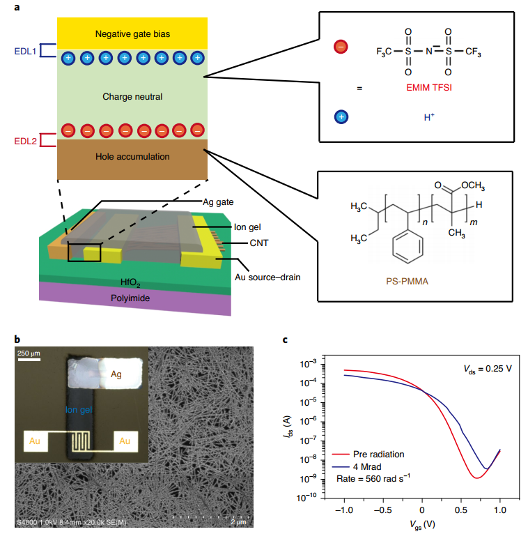 超强抗辐射碳纳米管场效应晶体管器件结构如图1a所示,该器件以超薄的聚酰亚胺作为基底。相较于常规的Si/SiO2而言,该基底可以有效消除高能辐照粒子在基底上散射和反射所产生的二次辐射效应。基地之上的导电沟道是通过气溶胶喷射打印技术制备的碳纳米管(电镜结构如图1b),由于碳纳米管具有超强的碳-碳共价键、纳米尺度横截面积、低原子序数等优势,相较硅基半导体导电沟道而言具备更强的抗辐射性能。最后,通过1-乙基-3-甲基咪唑啉双(三氟甲基磺酰基)亚胺(EMIMTFSI)离子液体与聚苯乙烯-聚甲基丙烯酸甲酯共聚物(PS-PMMA)凝胶化制备得到离子凝胶,并置于碳纳米管导电沟道之上。离子凝胶在导电沟道界面形成的双电层厚度较小,因此不仅具有较大的介电层电容增大电荷注入量,也大幅度减少辐射感生电荷陷阱。在该器件结构中,晶体管器件的导电沟道、介电层和基底的抗辐射性均得到增强,因此器件整体的抗辐射能力将大幅度提升。图1c为该晶体管器件的转移特性曲线,可以看出该碳纳米管场效应晶体管呈现出明显的p型场效应特征(空穴导电),亚阈值摆幅约为100 mV/dec。当器件受到4 Mrad辐射剂量后(蓝线),除了阈值电压与亚阈值摆福小幅度变化外,性能未受到明显影响,证实该晶体管器件具有较好的抗辐射能力。