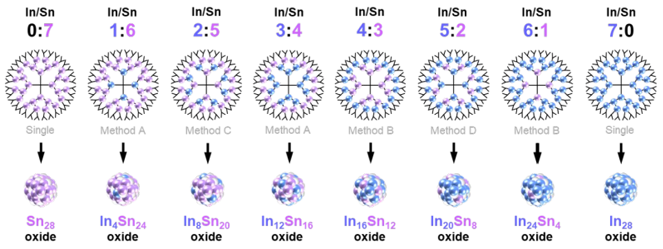 为了精确控制不同酸性金属盐与碱性亚胺的络合,作者使用第一代苯基偶氮甲基树状大分子(TPM-G1)作为模型化合物进行滴定,用以估算络合常数,并通过控制其氧化态、抗衡阴离子与配体的变化来控制电子和空间效应。作者提出了四种铟盐和锡盐的组合方法,并在这四种方法制备的树枝状聚合物的基础上,经过硼氢化钠的还原和空气中的氧化,成功合成了从100%铟到100%锡的连续成分控制(In / Sn = 0:7, 1:6, 2:5, 3:4, 4:3, 5:2, 6:1, 7:0)的铟锡双金属氧化物SNPs,不同比例与四种方法的对应关系如图2所示。