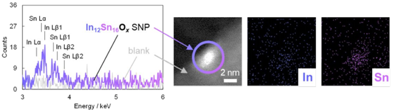 图3 In12Sn16Ox SNPs的STEM / EDS光谱表征,彩色线表示石墨烯基底上存在SNPs的区域,灰色线表示没有SNPs的区域