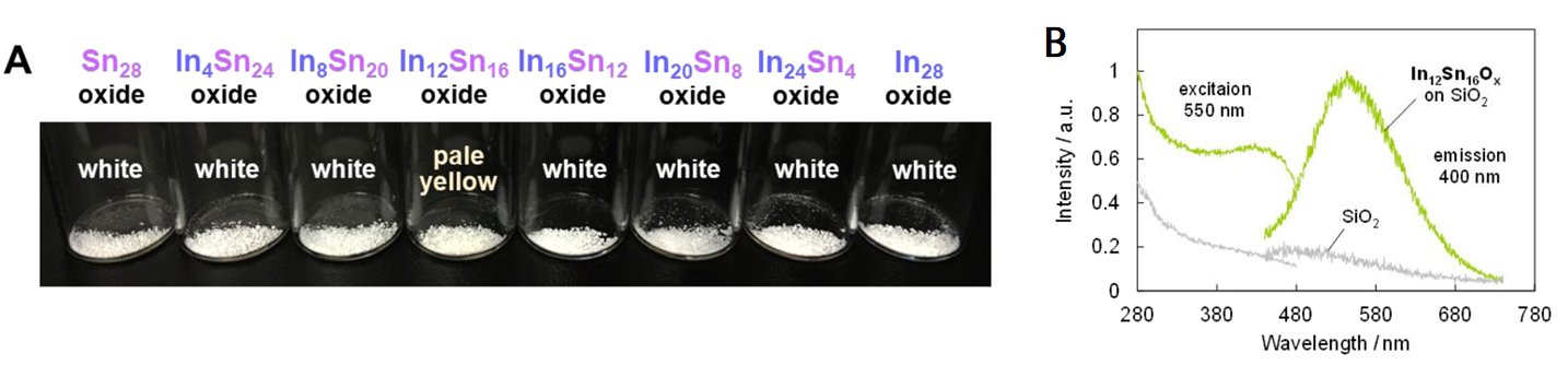 最后作者在SiO2基底上对SNPs进行光谱分析。比较单一金属氧化物的bulk,NP和SNP,可以发现SNP的吸收波长相对于bulk或NP的吸收波长发生了蓝移,这是量子尺寸效应导致的。双金属氧化物SNP中,只有In12Sn16Ox / SiO2被染成淡黄色,而其他SNP是无色的,如图5A所示,且淡黄色的In12Sn16Ox SNP在450 nm附近具有一个吸收带,这是从ns2型电子跃迁(5s2至5s15p1)产生的,仅在低价In(I)中可见,这一结果与XPS分析中观察到的电子状态一致。此外,In12Sn16Ox SNP表现出弱的绿色光致发光,分别在大约550和450 nm处观察到其发射和激发光谱峰,如图5B所示。