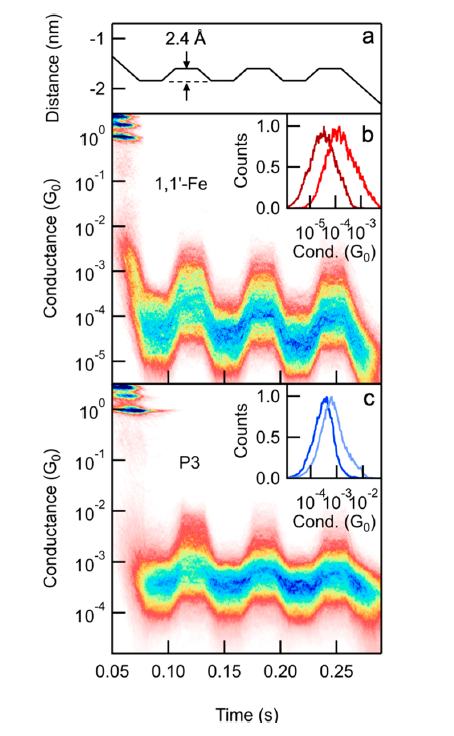 图4:a. 探针-基底间距随着时间变化的函数;b. 1,1’-Fe分子电导随时间变化函数;c. P3分子电导随时间变化函数;