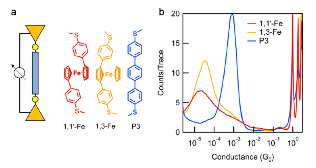 首先,作者运用了STM-BJ技术(如图1a左)测量了两种二茂铁衍生物分子1,1’-Fe 和1,3-Fe(如图1a红色和橙色)和一种芳香分子P3(如图1a蓝色)的电导并绘制了统计直方图(如图1b)。实验结果表明,与P3分子相比,二茂铁分子拥有更低的电导,并且,从峰的宽度可以看出二茂铁分子在裂结测试中展现出更广范围的电导值,作者认为这是由二茂铁分子中的两个环戊二烯基团易于围绕节点旋转的特性从而引起分子几何构型多样性所引起的。