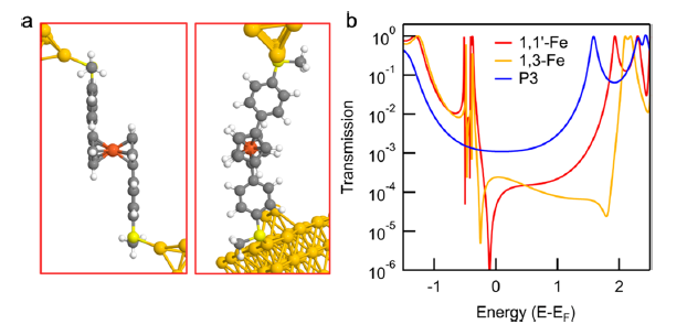 图2:a. DFT计算所使用的优化1,1’-Fe分子结构;b. 运用DFT计算得到的三种单分子的电子传输透射函数