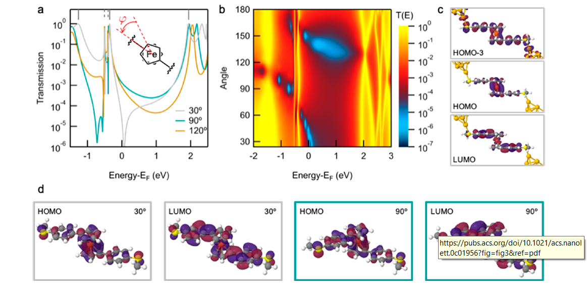 图3:a. 运用DFT计算得到的1,1’-Fe分子在不同构型(环夹角)下的的电子传输透射函数;b. 1,1’-Fe分子在240-1800环夹角范围内的2D-电子传输图谱;c. HOMO−3, HOMO, 和LUMO的分布状态;d. 1,1’-Fe分子中HOMO和LUMO在300和900环夹角下的节构图