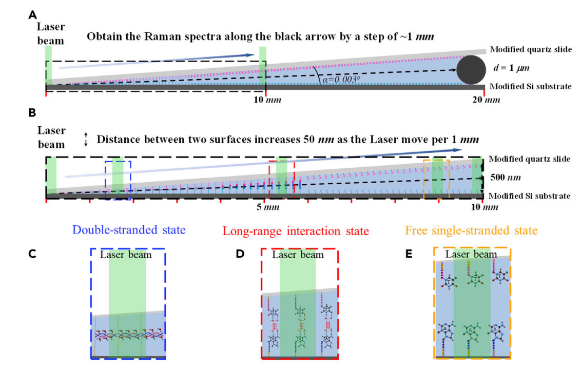 此处,作者采用双基板方法巧妙地构筑了连续的0 ~ 500 nm的纳米间隔。如图2A所示,两个经过修改的基板被放置在一起,并在一端由微球(直径约1 μm)隔开。两个基板之间的间隙从0到1μm持续增加,两个表面上不同DNA分子之间的相互作用随着两个表面之间的间隙距离的增加而变化。如图2B所示,激光束在两个基板表面的中间从0到10 mm(对应间隙距离从0到500 nm增加)之间连续移动,从而可以获得双螺旋态(图2C)、长程相互作用态(图2D)和自由单螺旋体(图2E)的拉曼光谱图。