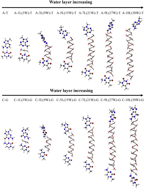 图 4 T、A、C、G之间水的螺旋结构,其中每个水层由三个水分子组成。