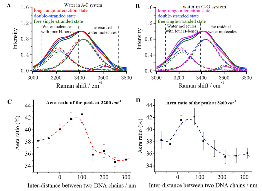 通过对拉曼光谱羟基振动峰的分析,作者得出了有关于长程弱相互作用中水的信息。其中3200 cm-1处的峰为形成氢键的有序水,配位数为4。如图3A和3B所示,不同状态下的3200 cm-1的峰强是不一样的,这表明有序水的含量与碱基对的状态和种类相关。为了进一步量化有序水与碱基对距离的关系,作者测试了0 ~ 10 mm间的不同位置,拟合出了一条相关性曲线,如图3C和3D所示。结果表明,不同的碱基对有着不同的最佳距离,A-T碱基对的最大长度约为50 ~ 100 nm,而C-G碱基对的最远距离为30 ~ 80 nm。